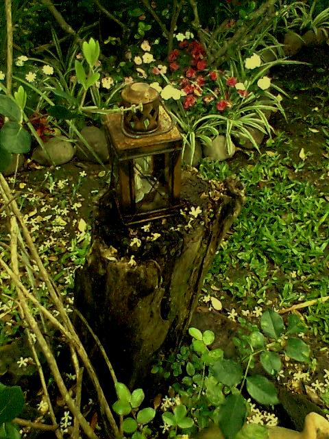 Este velho lampião de jardim colocado sobre o toco de uma árvore me leva diretamente à época em que eu o tinha em minha parede, junto ao jardim, e a luz delicada que se propagava dele em direção às flores, ao lago, à rua de areia.
