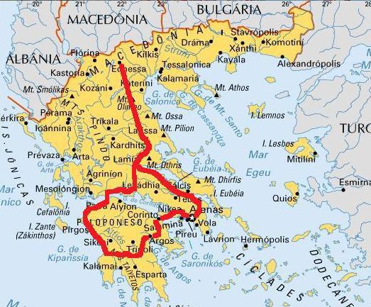 Ao lado, o mapa da Grécia e a trajetória, em vermelho, percorrida por filósofos clínicos. Em 11 dias de viagem, os colegas percorreram a maior parte do território grego.