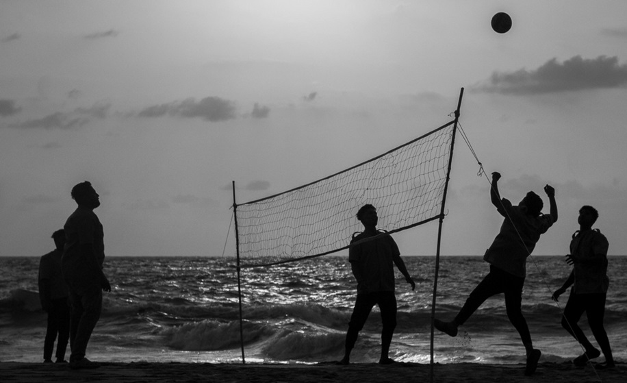 Brincando com bola na praia, na Índia.